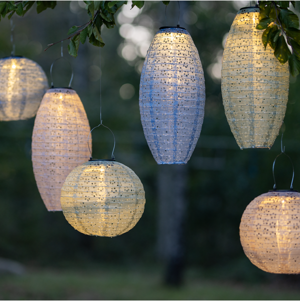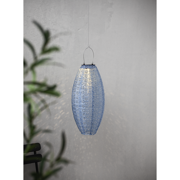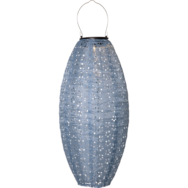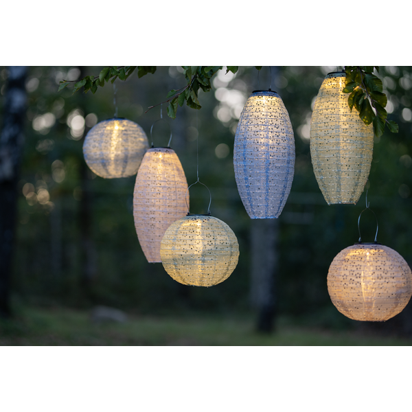 Solcellslyktan Festa är gjord av polyester med hålmönster som ger ett vackert skuggspel när den lyser i mörkret.