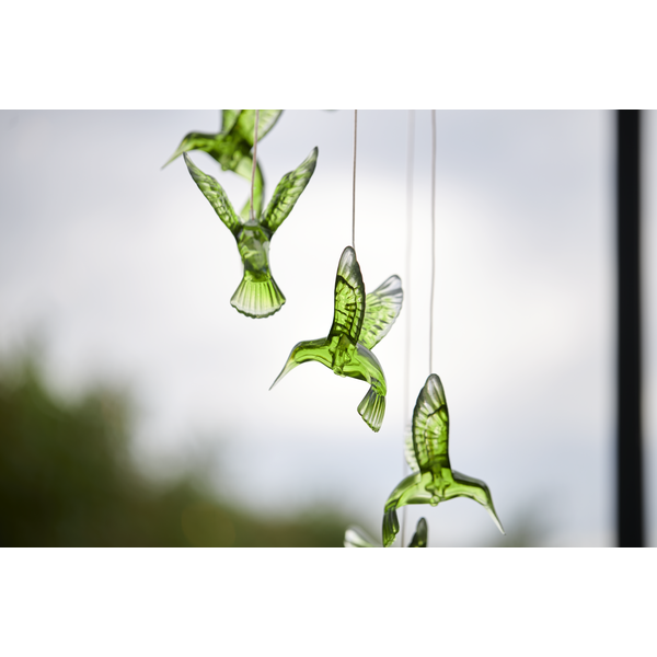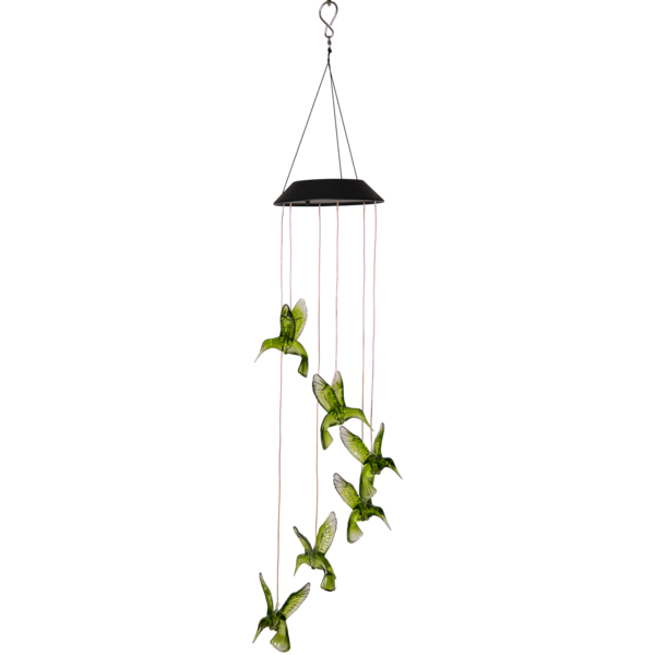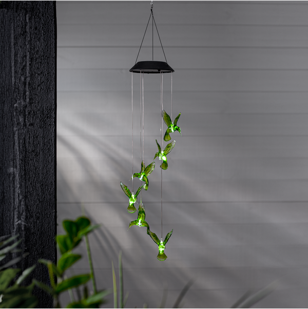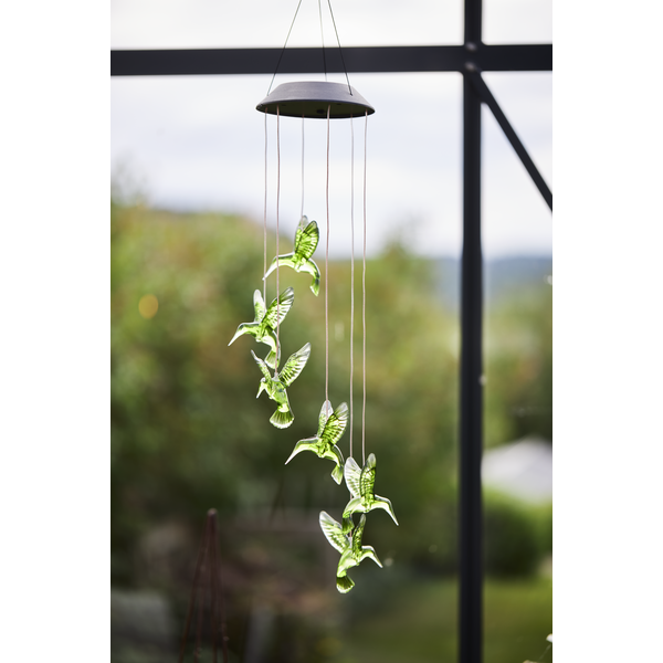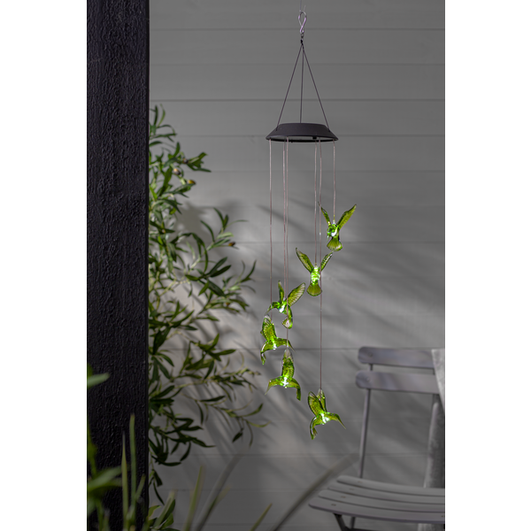 Solcellsdriven mobil med 6st gröna kolibrier. Vacker hängande i trädgården eller på en balkong både dagtid då de gröna fåglarna blir en dekoration och i mörkret när fåglarna lyser.